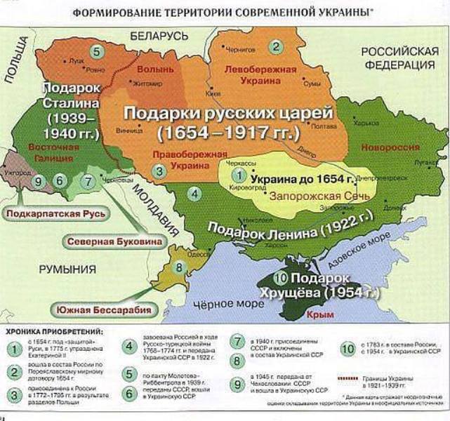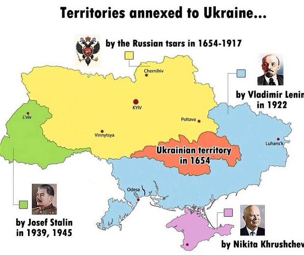 В 1654 году на общем собрании Переяславской Рады запорожские казаки во главе с гетманом Богданом Хмельницким решили объединиться с Русским царством, чтобы иметь защиту от Польши (Речи Посполитой). В тот же год 27 марта запорожские казаки подписали договор с Россией и присягнули на верность царю Алексею Михайловичу. После подписания договора Россия была вынуждена вступить в войну Польшей. В результате той войны 1654—1667 годов Киев и окрестные земли вернулись под российскую корону. Так началось формирование территорий, составивших современную Украину. Есть еще одна карта, наглядно показывающая хронологию формирования границ современной Украины. Здесь мы видим когда именно, в ходе какой войны были завоеваны те или иные области и в каком году вошли в состав современной Украины: