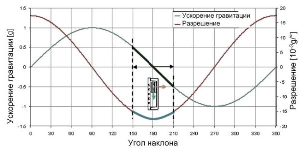 При построении графиков гравитации и разрешения относительно угла поворота, видно, что даже если акселерометр может обеспечить на выходе сигнал в диапазоне углов от 0 до 360 °, лучшей рабочей зоной является линейная и симметричная зона не более ± 30 ° в области значений гравитации от 0° и 180°.