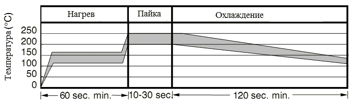 Учитывая, что монтаж резисторов поверхностного монтажа осуществляется в печках производители резисторов уделяют большое внимание температурной кривой нагрева и охлаждения резисторов. Типовая температурная кривая пайки резисторов поверхностного монтажа приведена на рисунке 6.