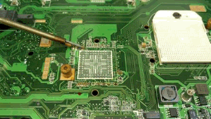 Такая диагностика поможет понять, на каком этапе происходит прерывание запуска портативного компьютера. Если проблемы в подаче питания – на модуль не будет поступать ток, и ноутбук не включится. Возможно, потребуется восстановление схемы управления питания или мультиконтроллера. Если индикатор загорается, но лэптоп не включается – нужно диагностировать южный или северный мост. Как выполняют ремонт материнской платы?