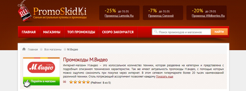 М.Видео – гигантская площадка самой современной техникиЕсли вас интересует все самое новое и интересное в мире современной техники, будь то бытовая или самая высокотехнологичная – заходите на страничку http://www.promoskidki.ru/mvideo-ru/, и вы поймете – если есть где-то рай для шопоголика – то он именно здесь. На этой площадке собраны более 20 тысяч технических новинок, которые всегда нужны и всегда важны. Все товары распределены по категориям, что делает их поиск весьма удобным и позволяет значительно сэкономить время. Наличие технических характеристик поможет выбрать именно ту модель именно той техники, которая вам так нужна. Но мы предлагаем еще воспользоваться возможностью значительно сэкономить при покупке столь нужной и очень своевременной вещи. Как именно это можно сделать – мы поделимся с вами своими знаниями.