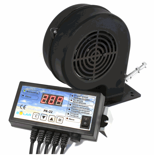 Благодаря наличию терморегулятора появляется возможность контроля максимальной температуры теплоносителя в теплообменнике котла, что позволяет добиться более-менее стабильных температурных показателей. Для расширения возможностей управления сжигания топлива устанавливается комплект оборудования, состоящий из вентилятора подачи топлива и контроллера вентилятором