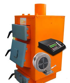 Кроме того, в систему могут быть включены циркулярный насос и регулятор тяги. Основной задачей автоматики является обеспечение оптимального режима сгорания топлива и безопасности работы ТК. В зависимости от показаний датчика температуры воды в котле контроллер вырабатывает различные команды режима работы вентилятора, установленного на месте заслонки: