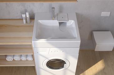 Раковины для размещения над стиральной машинойУ размещения раковины над стиральной машиной имеется очевидное преимущество: экономная компоновка. Такая компоновка позволяет разместить на минимуме площади сразу два важных устройства, и даже пристроить небольшой шкафчик. Для этого раковину нужно вынести чуть вперёд, и тогда на уровне колен корпус машинки не будет мешать. Таким образом, раковина над стиральной машиной – самый результативный способ экономии пространства. Но у такого решения есть и ещё один плюс: большее разнообразие раковин – кувшинок, так их называют из-за неглубокой формы, а также способов установки. Раковины устроены так, что вода сливается сзади, а не внизу, как у классических вариантов. Плоская конфигурация сифона оставляет больше пространство под раковиной. Помимо плюсов у такой компоновки есть некоторые недостатки.
