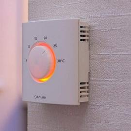 Принцип работы терморегуляторов Если тёплый пол – электрический или инфракрасный, терморегулятор определяет время включения и выключения нагревательных элементов. Если же используются водяные тёплые полы, устройство регулирует работу сервоприводов, снижающих или увеличивающих подачу горячей воды к трубам тёплых полов. В конструкцию входит терморегулирующее устройство и датчики (один или несколько). Размеры терморегулятора сопоставимы с размерами обычного клавишного выключателя, он имеет электронный, механический или программируемый интерфейс. В любом виде устройств может использоваться три вида датчиков: воздуха; пола; инфракрасный. Они могут находиться внутри терморегулятора, или быть выносными. Типы терморегуляторов Механические. Это надёжные устройства по невысокой цене, Панель управления представляет собой поворотный регулятор со шкалой температуры. Во многих моделях имеется таймер для настройки желательного времени начала подогрева. В устройство встраивается биметаллический датчик, меняющий объём или форму при изменении температуры, и тем самым замыкающий или размыкающий электрическую цепь. Устройства работают с гистерезисом на включение и отключение, это оптимизирует работу при достижении нужного уровня температуры.