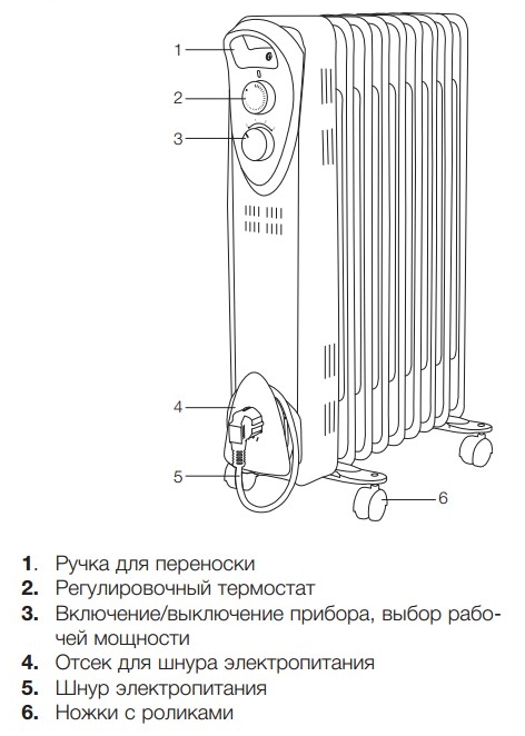 Особенности масляного обогревателяМеталлический прибор из нескольких секций, который формой напоминает стандартный настенный радиатор отопления. Перемещать по комнате можно на 4 колесиках, держа устройство за ручки на верхней части корпуса. Намотанный кабель с вилкой для подключения к сети — аппарат работает от электричества. Также на корпусе размещены переключатели с выбором режима нагрева, терморегулятор.