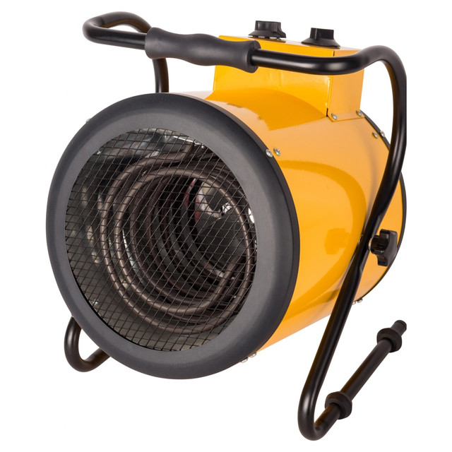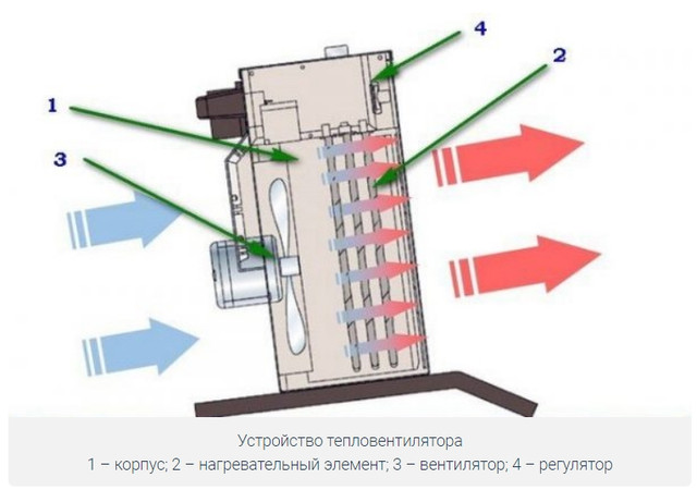 Особенности тепловентиляторовПортативный корпус может быть выполнен из металла или пластика. Снаружи расположены элементы управления (режимы работы, термостат). Внутри — основные части, за счет которых происходит работа — вентилятор и нагреватель.