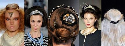 Диадема. Небольшая полукорона, одеваемая на голову, изготавливается из цветных сплавов и драгметаллов, инкрустируется камнями. Элегантное украшение используется в свадебных образах или для коронации победительниц конкурсов красоты. Красавицы Рима и Египта еще в глубокой древности украшали голову этими шикарными украшениями. Гребень. Аксессуар появился в викторианскую эпоху. Сегодняшняя мода диктует полную свободу и креатив относительно декоративных гребней. В качестве материала могут использовать пластмассу, дерево, кости и сплавы. Для украшения подойдут камни, цветы, стразы, гравировки и другие элементы. Существует два вида гребней: