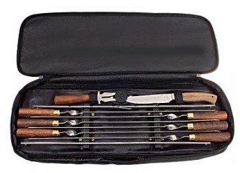 Любители непредвиденного отдыха, когда на сборы остается мало времени, обычно делают выбор в пользу комплекта с чехлом из мягкой кожи или синтетической ткани. Он легкий, не занимает много места, свободно переносится в руках и содержит в составе предметов только необходимое: шампура, мангал, ножи. Чем хороши шашлычные наборы? Помимо полной укомплектованности, есть и другие преимущества выбора в пользу шашлычного набора: