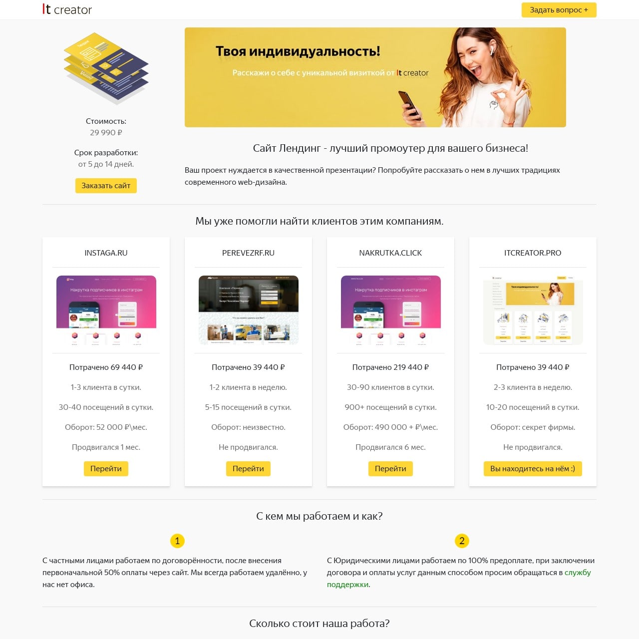 Создайте свой одностраничный сайт к профилю в сети. Лендинг пейдж лучший промоутер для вашего бизнеса в инстаграм, мы рекомендуем обязательно оставлять ссылки в профиле на ваш сайт, если вы еще не обзавелись посадочной страницей, настоятельно рекомендуем осуществить создание сайтов на заказ у качественной, недорогой и конечно проверенной веб студии с которой мы работаем уже много лет.
