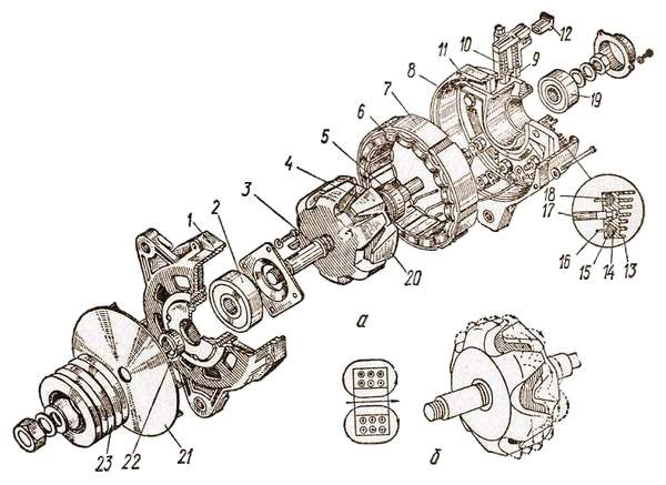 Состоит преобразователь энергии из нескольких основных элементов. Стартер несет на себе витки обмотки, в которой наводится электродвижущая сила. Станина – корпус, где размещены стартер и ротор. Составляющие стартера – пластины, за счет их большого количества предотвращаются вихревые неконтролируемые потоки электрического тока. Пластины выполнены из высокопрочной электротехнической стали. Подвижная (вращающаяся) составляющая генератора называется ротор. Он имеет определенное количество полюсных пар, в зависимости от производящей мощности устройства. На станине установлен специальный щиток (клеммный щит), который снимает напряжение. Как и много лет назад, современный генератор переменного тока на больших предприятиях занимает несколько комнат, опутанных системой медных проводов, стальных балок, изоляторов и прочих составляющих. Однако вся кажущаяся массивной конструкция требует от специалистов сборки с точностью до миллиметров, так как ни один другой генератор не преобразует электрический ток с такой эффективностью и непрерывностью. Одна ошибка сборщика — и потребуется представительство в арбитраже, так как порча материалов расценивается как служебное или экономическое преступление.
