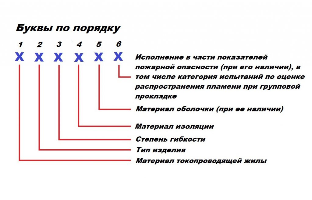 Маркировка кабельных изделийМатериал, количество слоев изоляции, противопожарная, химическая и климатическая стойкость, технические характеристики жил определяется маркировкой изделия. В зависимости от сферы применения кабельным изделиям присваивают буквенно-цифровое наименование (ГОСТ 31947-2012). Данный ГОСТ в измененной редакции No 1 введен в действие с 01.02.2021. Расположение и название букв и цифр, как и их отсутствие, определяют конкретные свойства и показатели кабеля, указывая на определенные параметры. Чтобы разобраться в хитросплетении таких обозначений воспользуемся следующей подсказкой.