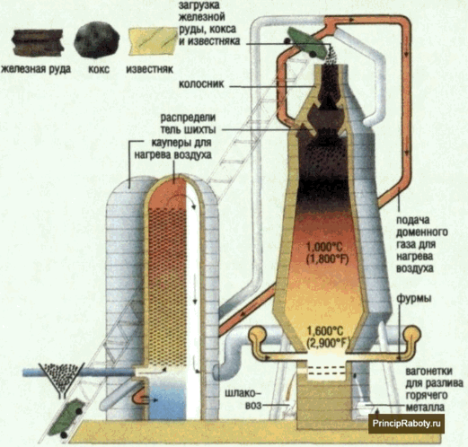 Принцип работы доменной печиВыплавка металла осуществляется из руды и пустых пород. В роли первых могут выступать железняк (шпатовый, бурый, красный) и марганцевые руды. Важно! Одним из наиболее значимых этапов формирования чугуна является процесс восстановления железа. Именно после восстановления железа оно приобретает необходимые прочностные характеристики. После очистки рабочий материал направляется в распар, цель которого заключается в удалении (растворении) углерода. После данного действия и начинается образование чугуна, который впоследствии начинает плавиться в горячей части установки и стекать вниз, заполняя установленные формы. Принцип действия доменных печей зависит от того, к какому типу они относятся. Всего их 2: