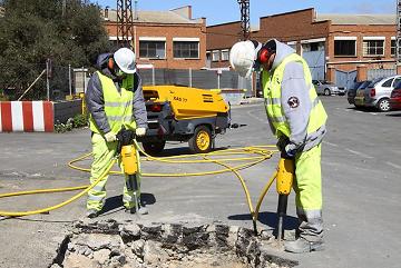 С бетоноломами, как правило, используются дизельные компрессоры 7 - 12 атм. Они работают автономно, это значит, что можно не привязываться к источникам питания. Обороты двигателя у таких компрессоров регулируются автоматически, и при снижении потребления воздуха они значительно экономят топливо.