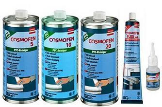 3. Cosmofen 5. Сильнорастворяющий очиститель полирует потёртости, сглаживает царапин и заращивает трещины. Сфера применения: непрозрачный жёсткий поливинилхлорид, полистирол, ПВВХ, АБС. Обладает сильными гигроскопическими свойствами, поэтому его следует применять только в сухих условиях. 4. Cosmofen 10. Обладает слаборастворяющим эффектом. Чистит профили, изготовленные из жёсткого поливинилхлорида. Эффективен против сильных загрязнений.