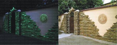 Применение отделочного материала Использовать Люмобетон можно при отделке фасадов, садовых дорожек, клумб и заборов. Внутри помещения материал может применяться как отделка каминов, кухонных фартуков, потолков и стен. Искусственный камень нарядно и эстетично выглядит при солнечном свете, в темноте же приобретает необычное «волшебное » свечение голубовато-зелёного, оранжевого, синего и некоторых других оттенков. Люминесцентный камень Люмобетон имеет целый ряд преимуществ в использовании: