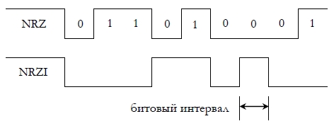 На стандартном штекере кабеля, контакты V-BUS и GND длиннее сигнальных, это позволяет подать питание раньше подключения сигнальных линий. Основная масса информации переда.тся с использованием дифференциальных приемопередатчиков. Сигнал передается по линиям в противофазе, по витой паре. Потенциал помехи добавляется к сигнальному напряжению на обоих проводах в равной мере, не влияя на разность напряжений. Применение дифференциальных при.мопередатчиков существенно повышает помехозащищ.нность. Дифференциальный передатчик способен выдавать на линии не только сигналы в противофазе, но и когда обе линии данных под высоким потенциалом или наоборот, когда обе линии под низким. Такие режимы не характерны для классических дифференциальных передатчиков. Кроме дифференциальных при.мников и передатчиков имеются устройства позволяющие измерять напряжения на каждой из сигнальных шин в отдельности, а не только разностный сигнал. Схема приемопередатчика FS (Full speed) приведена на рисунке 16. Здесь можно увидеть дифференциальные передатчики нисходящего порта хаба и USB устройства, а так же линейные приемники. Резисторы R5 и R6 по 15 килоом постоянно подключены к нисходящему порту хаба. Резистор R7 используется для целей энумерации, этот резистор спрятан в микроконтроллере AT90USB162 и подключается программно. Резисторы R3 и R4 внешние по 22 ом, для согласования и защиты от перегрузок, номинал задан в спецификации на микроконтроллер. Номинал резисторов R1 и R2, зависит от конструкции хаба и служат для целей согласования и защиты от перегрузок. Для передачи по линиям шины цифровой сигнал кодируется специальным линейным кодом. Вообще, при передаче данных по линиям связи применяются так называемые линейные коды. Простейший из известных – это униполярный NRZ (non return to zero). Логической 1 соответствует положительный импульс, а логическому 0 отсутствие. Биполярный NRZ - используется в RS-232, логическому 0 соответствует положительный импульс, а логической 1, отрицательный. Из необычных линейных кодов, можно упомянуть Манчестер II, логическая 1 кодируется отрицательным перепадом напряжения, а логический 0 кодируется положительным перепадом. Этот тип линейного кодирования используется в Ethernet. Шина USB использует код NRZI (non return to zero, inverted). Поток бит в коде униполярный NRZ, кодируется в NRZI и подается на дифференциальный передатчик. На приемной стороне, сигнал с дифференциального приемника раскодируется обратно в NRZ. У кода NRZI, есть существенный недостаток, если на вход кодера подается длинная последовательность единиц, то возможна потеря синхронизации с приемником. С этим борются техникой вставки дополнительных бит (bit stuffing), если входящий поток бит оказался больше, чем из 6 единиц, то вставляется ноль, а на приемной стороне этот ноль удаляется. Кодирование в NRZI и обратно происходит чисто аппаратными средствами. Рисунок 17 иллюстрирует принцип кодирования NRZI. При передаче логической 1, напряжение не меняется, а при каждом логическом 0, происходит переход на противоположный уровень. Длительность битового интервала для FS режима составляет 83,3 нсек.
