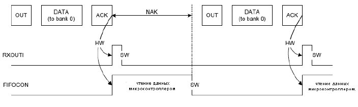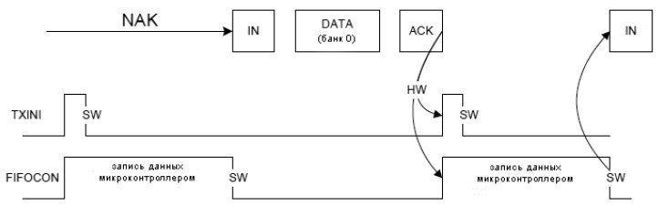 Если FIFOCON не сброшен, на все попытки хоста записать данные, SIE будет отправляться пакет квитирования NAK. На рисунке 23 показана транзакция записи. Транзакция чтения. Исходное состояние, флаги TXINI и FIFOCON установлены, в буфере конечной точки нет данных для отправки хосту. Загружаем данные в буфер, затем сбрасываем флаги TXINI и FIFOCON, TXINI сбрасывается первым. Устройство в состоянии ожидания пакета IN от хоста. После успешного выполнения транзакции чтения, флаги TXINI и FIFOCON аппаратно устанавливаются. С флагом TXINI, может быть связано прерывание, и загрузку данных можно выполнять в обработчике прерывания. Если FIFOCON не сброшен, то на все попытки чтения данных, хосту будут отправляться пакеты квитирования NAK. На рисунке 24 изображена транзакция чтения.