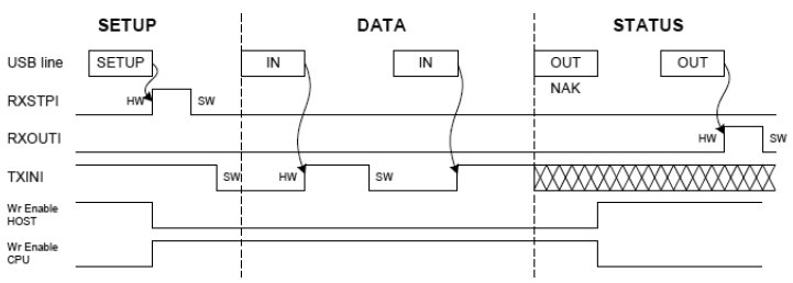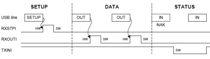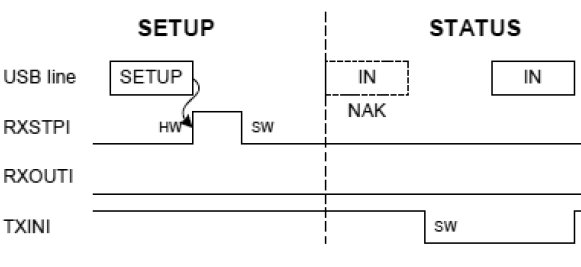 После стадии данных, стадия статуса. На стадии статуса, поступает пакет OUT и пакет ZLP от хоста, это вызывает установку флага RXOUTI. Установка флага сигнализирует о завершении транзакции статуса, далее программно сбрасывается этот флаг.