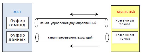 Управляющий канал используется для передачи команд протокола USB, передача данных с использованием канала управления, не является стандартным использованием канала. Хотя можно приспособить канал управления для передачи данных прикладной программы. В каждом USB устройстве должен быть хотя бы один управляющий канал. Канал передачи по прерыванию используется для передачи небольших объ.мов данных, но с гарантированными задержками. Хост опрашивает USB устройство на предмет готовности порции данных и если USB устройство готово для обмена, то обмен происходит. Время реакции USB устройства зада.тся при конфигурировании и лежит в диапазоне от 1 до 255 миллисекунд. Так что это не связано напрямую с прерываниями в общепринятом понимании. Один канал по прерыванию типа ввода, используется в мыши USB. По каналу передаются клики и координаты указателя. В моей клавиатуре USB используется два канала по прерыванию и один канал управления. Изохронные каналы – применяются для передачи потока данных, например аудио и видео. Характерной особенностью, является отсутствие повторной передачи данных в случае ошибок. Поврежд.нные пакеты просто отбрасываются без запроса повторной передачи. Такая политика позволяет воспроизводить поток данных в реальном времени, без временных задержек. С периодом в 1 миллисекунду хост запрашивает данные, и буфер USB устройства переда.тся на хост. В веб камерах используются изохронные каналы.Канал передачи массивов данных используется в типах устройств, не требующих временной привязки при передаче данных и оперативной реакции на внешние события. Принципиальное отличие от двух предыдущих типов каналов, что не гарантирован временной интервал, по истечении которого данные будут доставлены. В изохронном канале хост опрашивает устройство с частотой 1 миллисекунда. В канале передачи по прерыванию, хост может опрашивать USB устройство с частотой от 1 до 255 миллисекунд. В канале передачи массивов, хост начинает запрашивать данные для приема в свободное от всех остальных передач время. В случае искажения данных при передаче, происходит повторная передача искаж.нных данных. В моей флэшке используется два канала передачи массива данных, один на передачу и один на при.м, не считая канала управления. У USB устройства, при.мником и передатчиком данных служит буфер, который называется конечная точка. Тип конечной точки определяет тип канала, который связывает е. с хостом. Например, контроллер USB микроконтроллера AT90usb162 фирмы Atmel, имеет в общей сложности 4 конечные точки, не считая конечной точки управления, 4 возможных буфера обмена. Программа микроконтроллера, должна соответственно сконфигурировать необходимое количество конечных точек для своих нужд. Все конечные точки контроллера USB перенумерованы. Нулевая конечная точка всегда используется для нужд канала управления и не может быть переконфигурирована для других целей. Если не создается драйвер операционной системы, то на стороне хоста расположение буфера знать не обязательно, так как взаимодействие программы на стороне хоста с USB устройством происходит через системные вызовы операционной системы и скрыто от пользовательской программы.