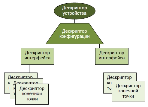 ДескрипторыИзвестно, что к проектированию архитектуры шины USB подходили весьма основательно. Хотели создать архитектуру, которая сможет удовлетворить потребности самых сложных периферийных устройств, широкого спектра применения. Для этого придумали достаточно сложную структуру иерархических данных, называемую набор дескрипторов. В этой структуре, формат которой строго регламентируется стандартом, должна храниться вся информация, с помощью которой хост может автоматически конфигурироваться и начинать нормальную работу с USB устройством. Именно набором дескрипторов USB устройства обменивается с хостом во время процесса энумерации. Имеется 4 основных типа дескрипторов: дескриптор устройства, дескриптор конфигурации, дескриптор интерфейса и дескриптор конечной точки. Все эти виды дескрипторов должны обязательно присутствовать в USB устройстве. Рисунок 3 поясняет сказанное.