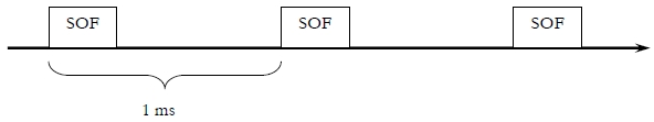 Пропускная способность шины делится на временные окна. Начало временного окна отмечается служебным пакетом SOF (Start Of Frame). Пакет SOF транслируется каждую 1 миллисекунду корневым хабом и широковещательно распространяется по всему дереву хабов, достигая каждого из USB устройств. За 1 миллисекунду, при частоте 12 мегагерц, теоретически можно передать максимально 1500 байт данных. Заметим, что тактовая частота в 12 мегагерц является стандартной для шины USB. Дополнительные затраты на SYNC и EOP, снижают максимально возможный размер данных передаваемых в одном временном окне, до 1200 байт. Пакет SOF состоит из идентификатора пакета PID, данных и контрольной суммы. Контрольная сумма пакета SOF имеет размер 5 бит. Данные пакета имеют размер 11 бит. Это число, длиной 11 бит монотонно увеличивается с каждым пакетом, при переполнении обнуляется и вновь возрастает. Цикл длится 2048 ms. Некоторые устройства используют этот сч.тчик для привязки к реальному времени. Пакет SOF не содержит адресной части, так как является широковещательным и не требует квитирования. Не надо забывать что, как и всякий пакет, пакет SOF содержит преамбулу и концевик. Завершение временного окна, отмечается особым состоянием сигнальных проводов, которое получило название EOF(End of frame). Это состояние молчания.
