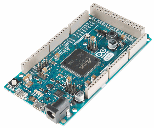 Arduino Due — плата микроконтроллера на базе процессора Atmel SAM3X8E ARM Cortex-M3. Это первая плата Arduino на основе 32-битного микроконтроллера с ARM ядром. На ней имеется 54 цифровых вход/выхода (из них 12 можно задействовать под выходы ШИМ), 12 аналоговых входов, 4 UARTа (аппаратных последовательных порта), a генератор тактовой частоты 84 МГц, связь по USB с поддержкой OTG, 2 ЦАП (цифро-аналоговых преобразователя), 2 TWI, разъем питания, разъем SPI, разъем JTAG, кнопка сброса и кнопка стирания.