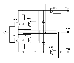 Рис. 1При разработке схем с использованием транзисторов IGBT, в которых та-кая ситуация возможна, следует особое внимание уделять ограничению максимальных токов и ограничению dV/dt. Для этого существует ряд известных способов, в частности, правильный выбор тока защиты, выбор резистора затвора Rg и использование цепей, формирующих траекторию переключения. Все эти методы описаны в руководствах по использованию транзисторов. С эффектом защелки ведется успешная борьба. Так, например, в "Рекомендациях по применению" фирмы International Rectifier уже в начале 90х годов указывалось, что триггерная структура подавлена полностью, и защелка исключена при всех режимах работы, включая ток короткого замыкания и любые достижимые фронты напряжений и токов. В документации SIEMENS 1997г. также говорится, что в транзисторах нового поколения паразитная полупроводниковая тиристорная структура отсутствует. В результате этого эквивалентная схема приобретает вид, показанный на рис.1б). Кроме отсутствия эффекта защелкивания при этом обеспечивается также прямоугольная область безопасной работы (SOA), что особенно важно для разработчиков. Однако защелкивание в микросхемах драйверов остается серьезной проблемой, с которой неизбежно сталкивается пользователь, работающий с практическими схемами. Причем, в документации, выпускаемой фирмами-разработчиками, этой проблеме внимания почти не уделяется. Механизм возникновения защелки в драйверах несколько иной, чем это показано выше. Процессы, происходящие в выходных каскадах драйверов, подробно описаны в 1 . На рис. 2 показан типичный выходной каскад драйвера, образованный комплиментарной парой КМОП транзисторов MP1 и MN1. В схеме также присутствуют паразитные биполярные двухколлекторые транзисторы OP1, ON1, OP2, ON2, связанные с активными КМОП транзисторами и их внутренними диодами. Именно эти биполярные транзисторы и формируют триггерную PNPN структуру, приводящую к защелкиванию.