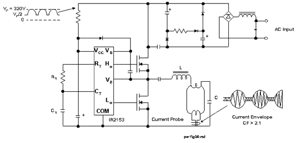 Рис. 7. Схема, использующая принудительное регулирования тока лампы 40 Вт балластом с предварительным нагревом и диапазоном входного напряжения от 180 до 280 В (переменного тока)Используя вышеописанный метод управления, можно спроектировать балласты для люминесцентных ламп с коэффициентом мощности выше 0,95, с ТНД (полный коэффициент гармоник) менее 15% , пик-фактором менее 1,7 без дополнительного ус-ложнения и значительного увеличения цены конструкции за счет применения активного повышающего корректора коэффициента мощности и возможностью адаптации к широкому диапазону входного напряжения, т.к. управляемым параметром является только ток лампы. Конечно, поскольку ток лампы регулируется этой схемой, необходим лишь не-большой шаг по замене резистора-датчика изменяющегося тока для реализации регулирования яркости лампы, которая сохраняя состояние предварительного разогрева дополнительно может быть зажжена и будет работать в режиме регулирования освещенности. Схема на рис. 7 работает в очень широком диапазоне входного напряжения пе-ременного тока и обеспечивает яркости. Ограничительная с 50% заполнением схема пассивной коррекции коэффициента мощности, представленная на рис. 3, используется для запитывания положительной шины, имеющей размах пульсирующего напряжения от 160 до 330 В при удвоенной промышленной частоте. Небольшой трансформатор тока используется для считывания тока дуги лам-пы, и несмотря на то, что на рис. 7 это выглядит сложно, он реально является просто тороидом с одной обмоткой и с обоими катодными выводами, проходящими через тороид с образованием одновитковых противофазных обмоток. При работе противофазные обмотки подавляют токи катодов лампы, оставляя только ток дуги в качестве измеряемого параметра. Сам тороид представляет собой малый ферритовый сердечник, такой, какие используются в балластных схемах с трансформаторным возбуждением, стоимостью около 0,1$. Вторичная обмотка создает напряжение на резисторе 2,7 К, пропорциональное току лампы, и это напряжение используется в качестве опорного смещения для управления частотой генератора, как описано на рис. 5. Постоянная времени схемы управления составляет менее 100 мс, что достаточ-но для регулировки вида кривой тока к мгновенным значениям 50% заполненного ограниченного напряжения. Управляющая цепь помогает достичь значения пик-фактора лампы ~ 1.6, по сравнению со значением выше 2.1 без регулировки тока лампы. IV. Предварительный разогревОпорное смещение постоянного тока может также использоваться для управ-ления частотой при предварительном разогреве лампы. Малый n-канальный МОП ПТ в сочетании с цепочкой RC с постоянной времени 1 секунда дает максимальное опорное смещение, т.е. максимальную рабочую частоту в период предварительного разогрева. Поскольку напряжение затвора возрастает выше порогового напряжения VTН, МОП ПТ медленно включается и снижает рабочую частоту за счет уменьшения опорного напряжения. В течение этого колебания частоты, лампа мягко стартует и результирующий ток лампы затем регулируется опорным напряжением в режиме замкнутого контура. Для достижения максимального срока службы лампы предварительный разо-грев нити катодов лампы должен достигать температуры 700 °С (красный нагрев) во время поджига. Период времени для предварительного разог
