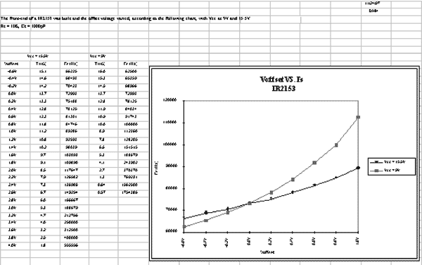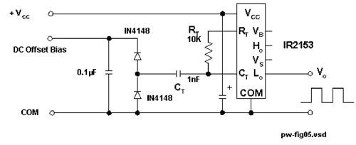 Рис. 5. Управление частотой смещающим опорным напряжениемIII. Работа генератора, управляемого напряжением, с использованием управ-ляющих ИС IR215хИС IR2155, 2151, 2152, 2153 являются автогенераторными драйверами со сдвигом уровня, включающими генератор аналогичный всегда популярный ИС таймера серии 555. Этот генератор использует времязадающий конденсатор и резистор и переключается когда конденсатор заряжается и разряжается до напряжений 1/3 Vcl и 2/3Vcc. Все управляющие ИС IR215х имеют внутренний зенеровский уровень Vcc около 15,6 В (постоянное напряжение), поэтому истинные уровни переключения выводов CT со-ставляют 5,1 и 10,2 В, соответственно, а это означает, что времязадающий конденсатор заряжен и разряжен при напряжении 10,2 - 5,1 В = 5,1 В при достижении напряжений переключения. При добавлении переменного опорного напряжения к времязадающему конту-ру, истинное изменение напряжения на времязадающем конденсаторе синхронизации уменьшается на величину этого опорного напряжения. Таким образом, если опорное напряжение составляет, например, 3 В, то конденсатор заряжается и разряжается в диапазоне значений 5,1-3=2,1 В, поэтому очевидно, что для процесса где D V равно 2,1 В, потребуется меньше времени, чем когда D V равно 5,1 В. Поскольку RT и Vcс являются постоянными, то можно легко видеть, что время достижения уровней переключения 5,1 и 10,2 В уменьшается примерно на 60%, следовательно, частота переключения также должна возрасти на 60%. Кроме того, очевидно, что опорное напряжение переменного тока равно опор-ному смещению постоянного тока + 2VF диода IN 4148. Отметим также, что при изменении опорного смещения потоянного тока, нижний вывод CT принимает значение смещения постоянного тока, но на возросший заряд это не влияет. Графики рис. 6 представляют собой экспоненциальные кривые, зависимости заряда на С1, когда заряд идет через R1 от фиксированного напряжения Vcс. Вследствие этой нелинейности метод управления с помощью опорного напряжения не подходит для применения в разомкнутом контуре, в котором необходимо использовать часть вы-прямленного напряжения рис. 4 в качестве управляющего параметра.