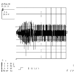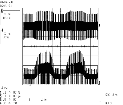 Из рис. 8. Видно, что отсутствует большой выброс тока при старте лампы, что помогает удлинить срок службы лампы. Форма кривой тока лампы на рис. 9. показывает расширение в точке поджига и постепенное увеличение тока вплоть до стационарного режима. Кроме того, показано регулирование тока лампы в зависимости от больших пульсаций 120 Гц на выходе полумостового инвертора. Измерения формы кривой тока дают значения пик-фактора меньше 1,63, где: СF (пик-фактор) = Пиковый ток/Действующее значение тока = 130 мА/180 мА= 1,625Значения пик-фактора менее 1,7, которые рекомендуются производителями ламп, максимально связанные с мягким стартом, как показано в этом балласте, приводят к максимальному ожидаемому сроку службы лампы. На рис. 9. отмечено 50%-ное напряжения пульсаций на выходе инвертора. Сравним это с верхней кривой тока. Показанный ток лампы управляется колебанием частоты, как описано в данной статье по применению. Эта форма кривой тока определяет ток в лампе с пик-фактором, равным 1,625.