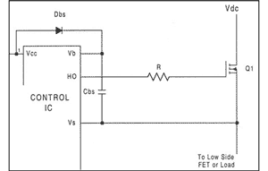 Рис. 1. Бустрепный контур диод/конденсатор для управляющих ИС фирмы IRСхема работает следующим образом. Когда VS понижается до потенциала земли (из-за МОП ПТ нижнего уровня или вследствие нагрузки, в зависимости от конфигурации схемы) бустрепный конденсатор (Cbs) заряжается через бустрепный диод (DBS) от источника питания 15 В (VCC). Таким образом обеспечивается требуемая величина VBS. 2. Факторы влияющие на бустрепный источник питанияСуществует пять влияющих факторов определяющих требования по питанию от СBS конденсатора. Это: