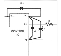 Выбор бустрепных компонентов для управляющих ИС1. Работа бустрепного контураНапряжение VBS (разность напряжений на выводах Vb и Vs управляющих ИС) обеспечивает питание контура драйвера верхнего уровня управляющих ИС. Напряжение этого питания должно находиться в диапазоне 10 - 20 В, чтобы управляющая ИС могла обеспечить полное насыщение управляемого ею полевого транзистора (МОП ПТ). Некоторые из управляющих ИС International Rectifier включают схемы детектирования пониженного напряжения VBS для гарантирования того, что ИС не запустит МОП ПТ, если напряжение VBS упадет ниже определенного уровня ( значение VBSUV в справочных листах). Это предотвратит работу МОП ПТ в режиме рассеяния большой мощности. Это напряжение питания VBS является плавающим напряжением, привязанным к верхнему уровню напряжения VS (которое в большинстве случаев имеет форму высокочастотных прямоугольных импульсов). Существует много способов генерации плавающего напряжения VBS, одним из которых является описанный здесь бустрепный метод. Этот метод имеет преимущества вследствие простоты и дешевизны реализации, однако на его применение накладываются некоторые ограничения, скважность и время включения ограничены требованиями подзарядки бустрепного конденсатора (длительное время включения и высокие коэффициенты заполнения требуют наличия схемы зарядового насоса -см. статью по применению А N 978). Бустрепный источник питания формируется комбинацией диода и конденсатора ( как показано на рис.1).