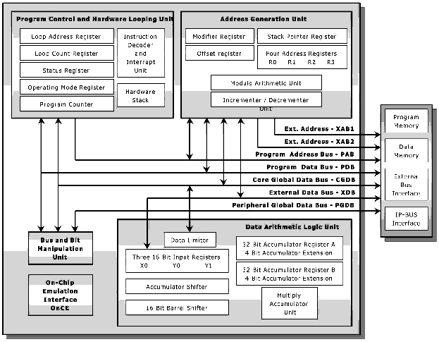 Возрастающая производительность и простота применения цифровых сигнальных процессоров (DSP) вывели их на уровень серьёзной альтернативы микроконтроллерам. Чтобы эти процессоры можно было применять в устройствах управления они должны выполнять функции общего назначения. Для этого ядро должно выполнять функции микроконтроллера, а в состав микросхемы должен входить соответствующий набор периферийных устройств: таймеров, интерфейсов, аналого-цифровых преобразователей, модулей памяти. В ответ на возросшие запросы потребителей фирма Motorola разработала новую архитектуру микросхемы, ориентированную как на выполнение сложных алгоритмов цифровой обработки сигналов, так и на решение задач управления. Семейство микросхем DSP568xx построено на базе ядра 16-разрядного процессора DSP56800 с фиксированной точкой. Это ядро предназначено для эффективного решения задач управления и цифровой обработки сигналов. Реализованный в нем набор команд обеспечивает цифровую обработку сигналов с эффективностью лучших DSP общего назначения и отвечает требованиям простоты создания компактных программ управления. Ядро DSP56800Ядро DSP56800 является программируемым 16-разрядным КМОП процессором, предназначенным для выполнения цифровой обработки сигналов в реальном масштабе времени и решения вычислительных задач. Ядро DSP56800 (рис. 1) состоит из четырех функциональных устройств: управления программой, генерации адресов, арифметико-логической обработки данных, обработки битов. Для увеличения производительности операции в устройствах выполняются параллельно. Каждое из устройств имеет свой набор регистров и логику управления и организовано таким образом, что может функционировать независимо и одновременно с тремя другими. Внутренние шины адресов и данных связывают между собой память, функциональные и периферийные устройства (регистры периферийных устройств расположены в области памяти). Таким образом, ядро реализует одновременное выполнение нескольких действий: устройство управления выбирает первую команду, устройство генерации адресов формирует до двух адресов второй команды, а АЛУ выполняет умножение третьей команды. Есть альтернативная возможность: в третьей команде операцию может выполнять не АЛУ, а устройство обработки битов. Конвейерная архитектура позволяет реализовать параллельную работу устройств, входящих в состав микросхемы, и существенно сократить время выполнения программы. Конвейерная архитектура ядра DSP56800 оптимизирована для обеспечения эффективности цифровой обработки сигналов, компактности программ управления и обработки сигналов, и удобства программирования. Ниже приведены некоторые характеристики сигнального процессора: