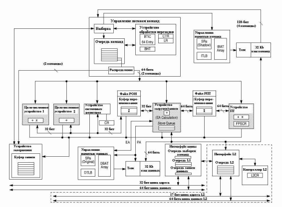 Поток командКак видно из рисунка, устройство управления потоком команд состоит из устройства последовательной выборки (fetcher), очереди из шести команд (instruction queue, IQ), устройства распределения команд и устройства обработки переходов (BPU). Оно определяет адрес следующей команды для выборки по информации из устройства выборки и BPU. Команда загружается из кэша команд в очередь команд. BPU извлекает команды перехода из последовательного загрузчика. Команды перехода, которые не могут быть обработаны немедленно, предсказываются с помощью специальных алгоритмов динамического или статического (определен архитектурой) предсказания переходов. Команды перехода, не влияющие на LR или CTR (регистры, содержащие адреса переходов), удаляются из потока команд. Команды из предсказанной ветви не завершаются, пока переход не обработан наверняка, сохраняя программную модель последовательного выполнения. Если переход был неправильным, устройство выполнения уничтожает все предсказанные пути команд и выбирает команды из правильной ветви. Очередь команд и устройство распределенияОчередь команд (IQ) содержит шесть команд и может быть загружена четырьмя командами за такт. Устройство выборки пытается загрузить команды на все свободные места в очереди. Все команды распределяются к соответствующим устройствам выполнения (IU1, IU2, FPU, LSU, SRU) из двух верхних позиций в очереди с максимальной скоростью две за такт. Устройство распределения проверяет зависимости регистров источника и приемника, определяет свободна ли место в очереди завершения команд, и распределяет последовательные команды по назначению. Устройство обработки переходовBPU получает команды перехода из устройства выборки и делает упреждающий поиск условных ветвей для их раннего предсказания, достигая попадания в большинстве случаев. Команды безусловного перехода или с известным условием могут быть предсказаны сразу. Для переходов с неопределенными условиями используется динамическое или статическое предсказание. Команды из предсказанной ветви выполняются, но не завершаются и не записывают результаты до подтверждения корректности перехода. Динамическое предсказание использует таблицу истории переходов (BHT) из 512 записей, кэш который содержит по 2 бита, определяющие 4 уровня вероятности перехода. Когда динамическое предсказание запрещено переход выбирается исходя из бита в коде команды для предсказания условных переходов. Когда переход сделан ( или предсказан), команды из остальных ветвей удаляются и загружаются команды из нужной ветви. BTIC - кэш на 64 элемента, содержащий команды из последних переходов. Когда команды находятся в BTIC, они считываются на следующем такте, иначе через один такт. BPU содержит сумматор для вычисления адресов переходов и использует три регистра - регистр связи (LR), регистр-счетчик (CTR) и CR. BPU вычисляет точку возврата из процедуры и сохраняет результат в LR определенных команд перехода. Также в регистрах LR и CTR содержат адреса для некоторых команд обработки переходов. Из-за использования специальных регистров обработка команд переходов независима от выполнения целочисленных команд и команд с ПТ. Устройство завершения командВ точке распределения команд, порядок выполнения команд поддерживается назначение команде места в очереди завершения на 6 мест. Устройство