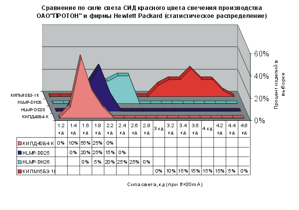 Рис. 2. Сравнение по силе света СИД красного цвета свечения производства ОАО "ПРОТОН" и фирмы Hewlett Packard (статическое распределение)