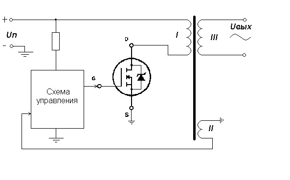 Схема управления генерирует импульсы управления полевым транзистором, регулируя их ширину в зависимости от падения напряжения на обмотке II, тем самым осуществляет стабилизацию колебательного процесса в контуре транзистор-трансформатор и, соответственно, напряжения на выходной обмотке III. Для такой схемы характерны простота конструкции и низкая себестоимость. Например , при применении в качестве схемы управления драйвера SGS Thomson TDA4605A, число электронных компонетов в схеме колеблется в районе 15-20. Качество работы всей схемы во многом зависит от характеристик транзистора, в особенности от такого важного параметра, как сопротивление сток-исток в полностью открытом состоянии (RDS(on)). Естественно - чем меньше это сопротивление, тем меньше тепловые потери, тем больше мощность источника питания. Сопротивление открытого транзистора является таким же важным инструментом в конкуренции на рынке электронных компонентов, как и собственно цена.