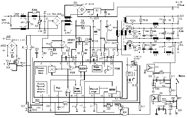 Благодаря улучшенному токовому режиму управления достигается стабильная широтно-импульсная модуляция от максимальной нагрузки до ее отсутствия. Окончательно, в случае условия отсутствия нагрузки ШИМ схема может быть по желанию выключена с помощью закоротки вывода 13 (PWM SS) на землю посредством управляемого транзистора VT4.