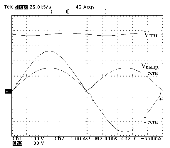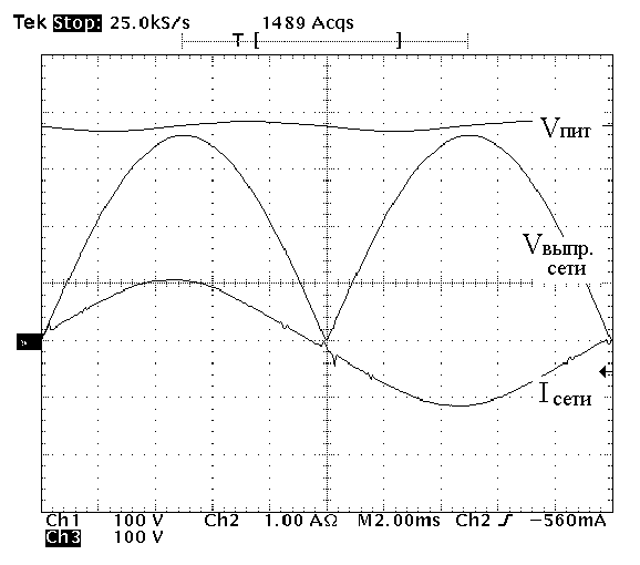 Рис. 2. Выпрямленное сетевое напряжение, потребляемый сетевой ток и напряжение промежуточной цепи постоянного тока.