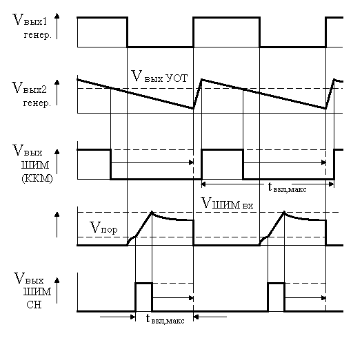 Рис. 3. Временные диаграммы напряжения на выходе генератора и широтно-импульсных модуляторов ККМ и ШИМ преобразователей