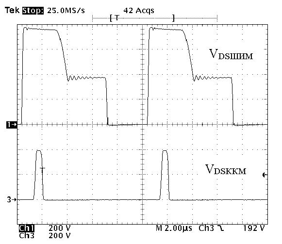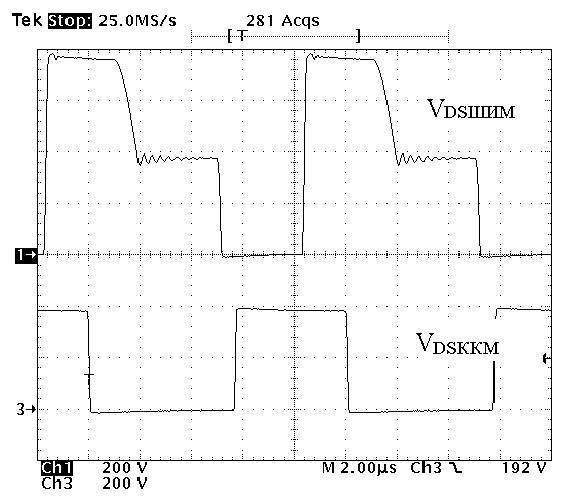Рис. 4. Временные осциллограммы напряжения сток-исток VDSККМ силового транзистора ККМ-преобразователя и напряжения сток-исток VDSШИМ ШИМ-преобразователя. а) при Vсети = 50В; б) при Vсети = 160В