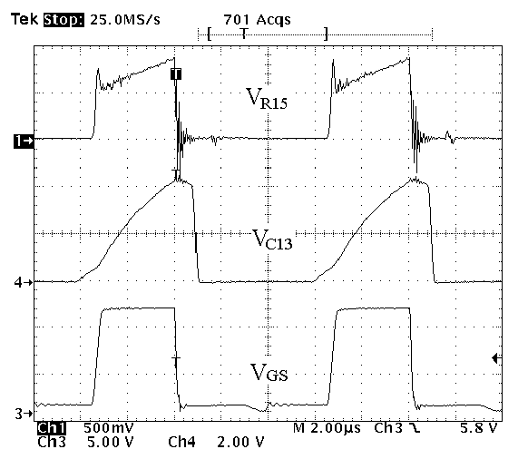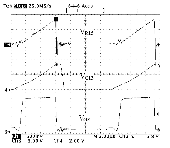 Рис. 5. Напряжение VR15 с шунта R15, пилообразное напряжение на С15, управляющее напряжение VGS силового транзистора ШИМ-преобразователя.