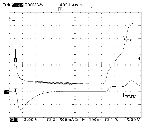 Рис. 6. Напряжение управления затвором и выходной ток драйвера. Включение с модулированным фронтом. Выключение с крутым фронтом