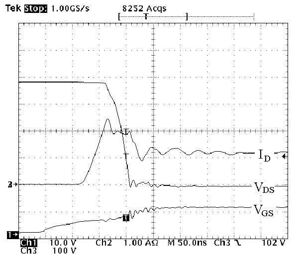Рис. 7. Напряжение сток исток, ток стока и напряжение управления затвором при включении МДП-транзистора с ограничением броска обратного тока диода на этапе выключения