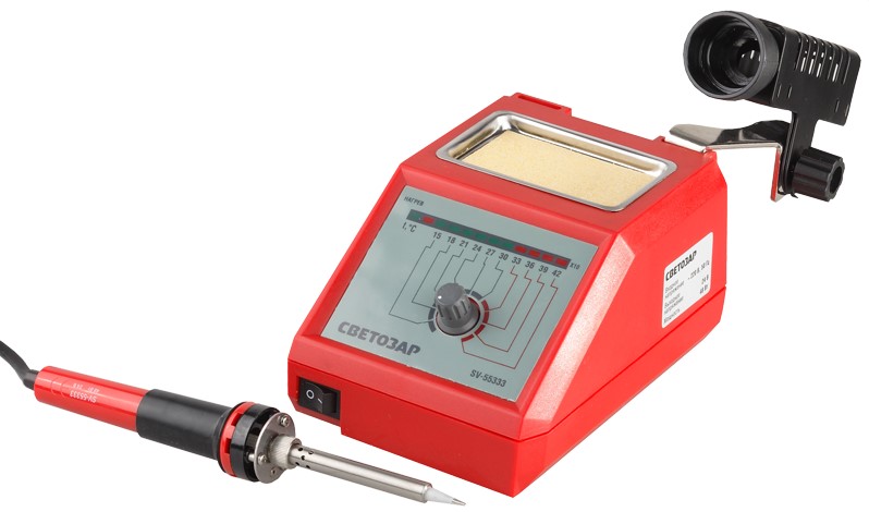 Приборы имеют приблизительно одинаковые технические характеристики. Базовым элементом является паяльник с керамическим нагревателем и температурным сенсором. Комплектация инструмента включает только жало конической формы. Однако докупить набор разнообразных наконечников для расширения функционала станции не составляет труда. Паяльник имеет мощность 40В и питается током с напряжением 24В. Это позволяет без риска повреждения проводить пайку чувствительных к статическому электричеству компонентов. Дополнительная безопасность такой работы обеспечивается заземлением жала. Температура паяльника регулируется электронным блоком в пределах +200–+480?C с погрешностью ±1?C. Ручка на лицевой панели станции поддерживает бесступенчатую плавную регулировку нагрева. Паяльник весит 55 г, имея при этом длину 190 мм, позволяя удобно работать монтажнику, независимо от размера руки. Для его подключения к блоку управления используется пятиштырьковый разъём. Станция комплектуется запасным нагревательным элементом НАККО-003 с термосенсором, губкой для очищения жала и подставкой для паяльника. Представленные для примера модели не имеют существенных эксплуатационных отличий, за исключением того, что функционал станции AOYUE 937 расширен за счёт цифровой индикации установленной и текущей температуры. Судя по всему, это позволяет устанавливать необходимую температуру более точно, нежели на устройстве без индикатора. Тем не менее, даже на модели с индикацией оператору приходится потратить некоторое время на подстройку по принципу «чуть больше, чуть меньше», пока он не добьётся нужной величины. Цифровые и аналоговые паяльные станции Классификация паяльных ламп по принципу управления делит их на две группы: аналоговые и цифровые. Первые являются более старым вариантом, в котором либо происходит нагрев паяльника, в зависимости от текущей температуры, либо нет. То есть по достижении определённой температуры нагреватель отключается, а при падении - включается. В принципе, для управления нагревателем может применяться простое электромагнитное реле. Минусами аналогового управления является низкая точность поддержания температуры и частый перегрев жала паяльника.