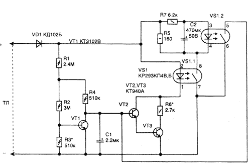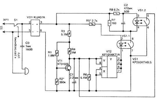 Рис. 1. Электрическая схема блокиратора В основе работы схемы, рис. 1, используется пороговое устройство на транзисторе VT1, который контролирует уровень напряжения в ТЛ. Как известно, при поднятии трубки с аппарата, напряжение в линии падает с 60 до 5...15 В (зависит от сопротивления цепей ТА). Режим работы VT1 настраивается резистором R2 так, чтобы он при напряжении ниже +18 В запирался. При этом транзистор VT2 током через резисторы R3-R4 откроется, что приведет к срабатыванию оптронного ключа VS1.1. Резистор R7 закоротит ТЛ, что воспрепятствует импульсному набору номера на время заряда С2. Как только С2 зарядится - сработает ключ VS1.2 и разрядит С1. Этот процесс периодически повторяется, что исключает фиксацию схемы в режиме закорачивания линии после однократного срабатывания блокировки. Конденсатор С1 обеспечивает нечувствительность схемы к сигналу вызова в линии. Устройство подключается параллельно звонку (или схеме звукового сигнализатора) до разделительного конденсатора так, чтобы при поднятии трубки оно отключалось контактами, связанными с положением трубки (S1). В этом случае не потребуется отключать устройство от линии при использовании собственного ТА, что удобно при эксплуатации. Схема не критична к выбору типов резисторов и конденсаторов. Вместо диодного моста VD1 можно использовать один диод, но в этом случае при подключении устройства к ТЛ потребуется соблюдать необходимую для работы полярность. На рис. 2 приведен второй вариант электрической схемы блокиратора. Она незначительно отличается от описанной выше и в пояснениях не нуждается - работает также.