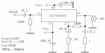 УНЧ Работоспособная схема при сравнительно невысокой цене микросхемы (по сравнению с импортными аналогами) и выходной мощностью ~18 Вт.