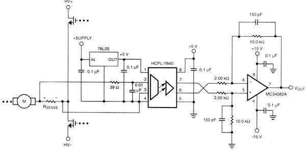 Описание HCPL-7840 - изолированный усилитель может быть использован для изолирования чувствительных элементов контроллеров управления двигателем от токов двигателя при этом HCPL-7840 может осуществлять передачу точных аналоговых сигналов. Микросхеме требуется дешевый шунтовый резистор для контроля тока двигателя. Напряжение через чувствительный резистор подается на HCPL-7840 на входы pin 2 и 3. Плавающий источник питания регулируется 5V при помощи простого трехвыводного регулятора напряжения 78L05. Дифференциальный выход HCPL-7840 преобразован в одноногий привязанный к земле выход напряжения с простой дифференциальной микросхемой усилителя. Краткая характеристика микросхемы