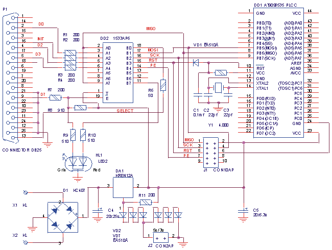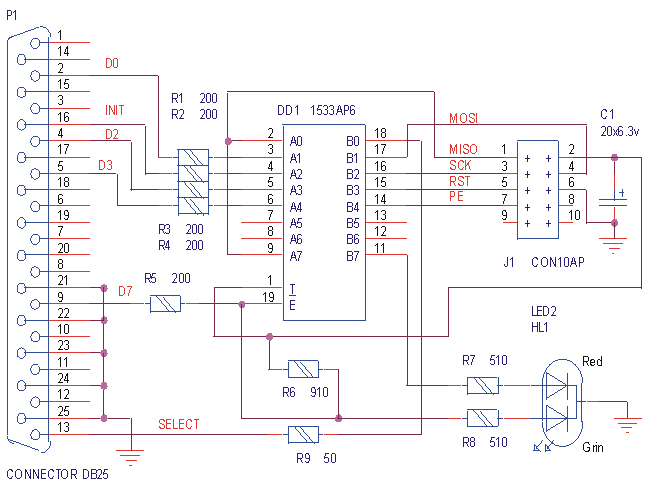 Первый девайс предназначен для In-System programming AVR микроконтроллеров фирмы Atmel через SPI интерфейс. Подключается к параллельному порту IBM PC совместимого компьютера и работает с программой avr_prog.exe ( слеплена Sdl's firmware). Выходной разъем по первым шести контактам совместим с атмелевским программатором avr910 (смотри www.atmel.com" target="_new">www.atmel.com и рисунок внизу), только добавлена ножка PE (программ энейбл) для программирования меги. Принцип работы прост, данные с компа идут через D0, INIT используется в качестве строба, выход SPI микроконтроллера подается на SELECT. Назначение сопротивлений по 200 Ом на входах апешки и 50 Ом на выходе ограничить ток при прошивке 3-х вольтовых схем, так как апешка питается от вашей схемы, а не от компа. Светодиод горит зеленым когда апешка в 3-ем состоянии (можно подключать шлейфик к вашему устройству ) и красным при программировании. Вторая схема тоже самое, но на плате установлена панелька для 8535. Разрабатывалась для себя и здесь приведена в качестве примера. При подключении желательно использовать модемный (не нуль) шнурок 25х25 и не увлекаться длинной шлейфика от девайса.